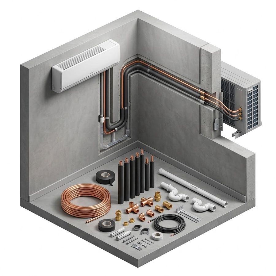 خدمة تأسيس مواسير التكييف قبل التشطيب باحترافية، تشمل تمديد المواسير، العزل الصرف، وتجهيز التكييف المخفي قبل أعمال التشطيب